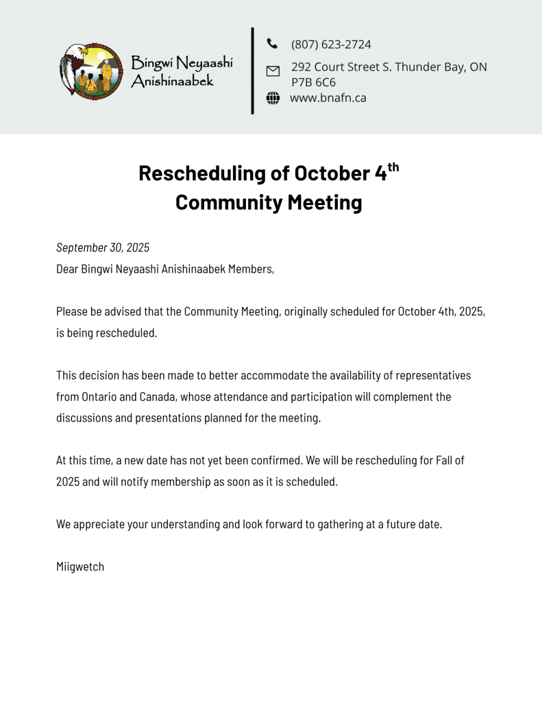 Dear Bingwi Neyaashi Anishinaabek Members,
