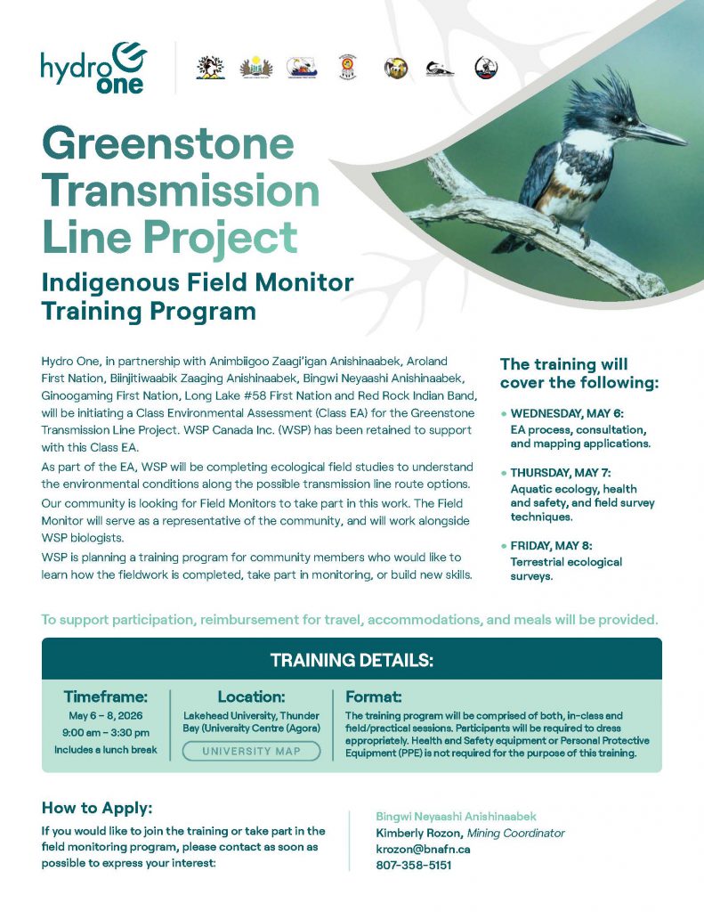 Hydro One, in partnership with Animbiigoo Zaagi’igan Anishinaabek, Aroland First Nation, Biinjitiwaabik Zaaging Anishinaabek, Bingwi Neyaashi Anishinaabek, Ginoogaming First Nation, Long Lake #58 First Nation and Red Rock Indian Band, will be initiating a Class Environmental Assessment (Class EA) for the Greenstone Transmission Line Project. WSP Canada Inc. (WSP) has been retained to support with this Class EA. As part of the EA, WSP will be completing ecological field studies to understand the environmental conditions along the possible transmission line route options. Our community is looking for Field Monitors to take part in this work. The Field Monitor will serve as a representative of the community, and will work alongside WSP biologists. WSP is planning a training program for community members who would like to learn how the fieldwork is completed, take part in monitoring, or build new skills.